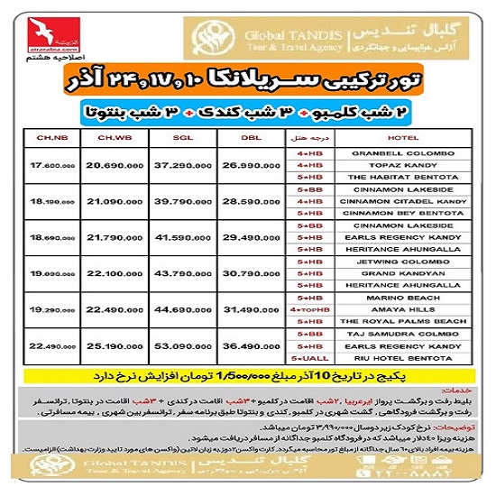 بلیط رفت و برگشت ایرعربیا . 2 شب اقامت در کلمبو+ 3 شب اقامت در کندی + 3 شب اقامت در بنتونا